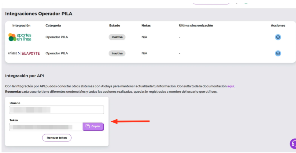 GET /v1/users/tokeno regenerarlo conPATCH /v1/users/token. - También puedes obtenerlo desde la interfaz web de Aleluya en el módulo de Integraciones.